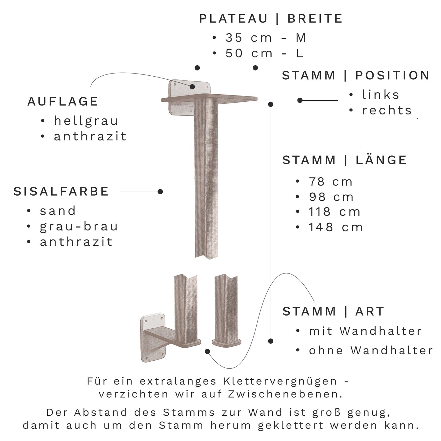 Our trunks are also angular and real eye-catchers. For reasons of stability but also for visual reasons, we manufacture our trunks from a single piece of wood - so the trunk is not visually interrupted by any connecting piece. We cover the sturdy solid wood trunk with sisal carpet. The sisal carpet gives the scratching post a natural touch, is extremely robust and is excellent for climbing on. In the 118 cm and 148 cm trunk lengths, a strip ensures that the sisal does not fray at the joints - this increases the longevity. You can choose from 3 trunk colours to match the mood of your living style. For PURE CLIMBING FUN, we have dispensed with intermediate levels in our scratching post. We have chosen a particularly large spacing of 24 cm - so your cat can climb around the trunk or simply hang out and stretch. This makes claw care very playful. By MOVING around the trunk, your cat can keep fit and exercise its muscles. It can act out its natural behaviour, scamper up a “tree trunk” and keep an OVERVIEW from an elevated position. Trunk position option - The trunk is located either on the left or right front corner of the plateau. Choose the position that best suits the intended mounting location.Plateau - relax in comfort